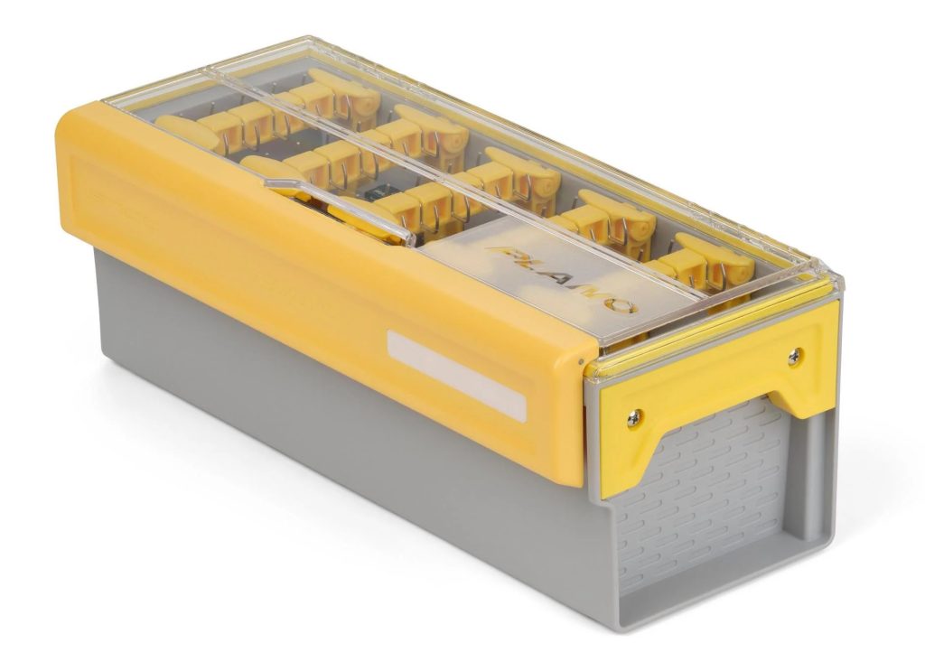 This durable storage box includes a reusable moisture-wicking packet and features individual line tie hangers to provide secure and accessible tangle-free storage of hollow-bodied frogs. By hanging frogs vertically, their legs dry quickly, which maintains the integrity of each bait while preventing dry rot and rusting of hooks.