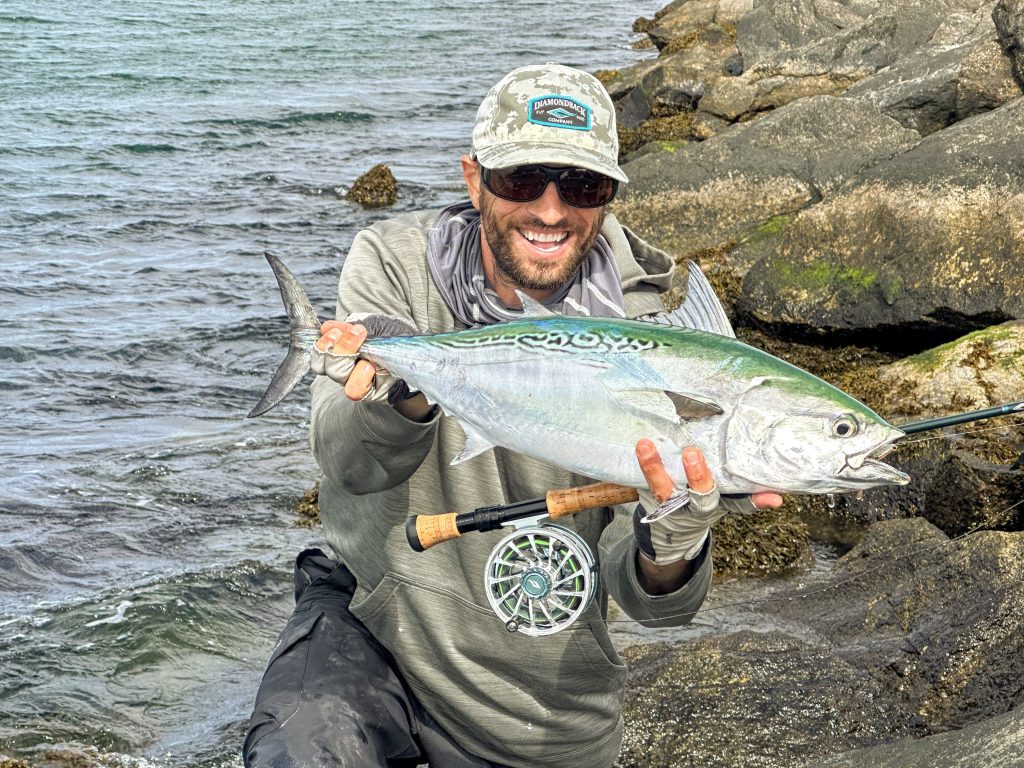Immerse yourself below twelve feet of clean, blue ocean water backlit by skylight, as false albacore work together to corral a pack of baitfish toward the surface. As the minnows huddle against each other for safety, albies hunt from below, cruising beneath the bait ball before suddenly accelerating up through the water column to eat a certain vulnerable minnow in a flash of calculated motion.