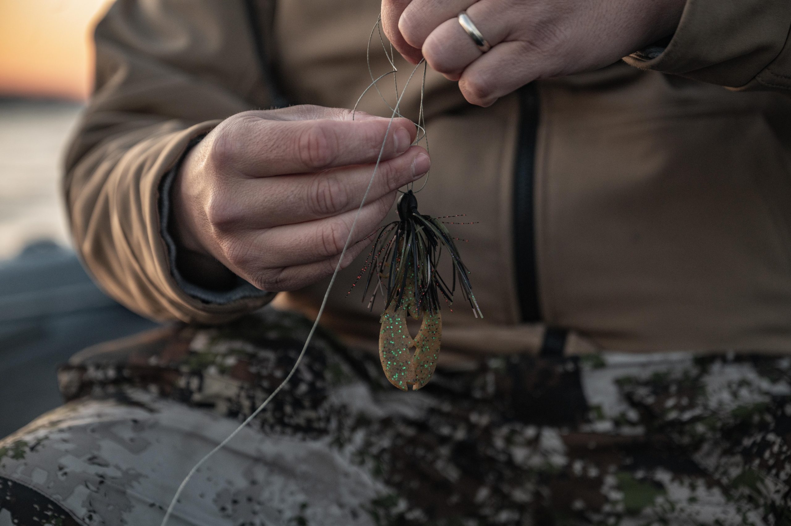 In 2024, we fished quite a few ½-ounce Beast Coast Lil Magnum jigs, swapping to ¾-ounce as the season progressed. In 2025, we needed to switch to ¾-ounce much earlier. The same combination of jig and Berkley MaxScent Chigger Craw produced every single jig fish. Color didn’t matter much, but we prioritized black and blue as often as possible.