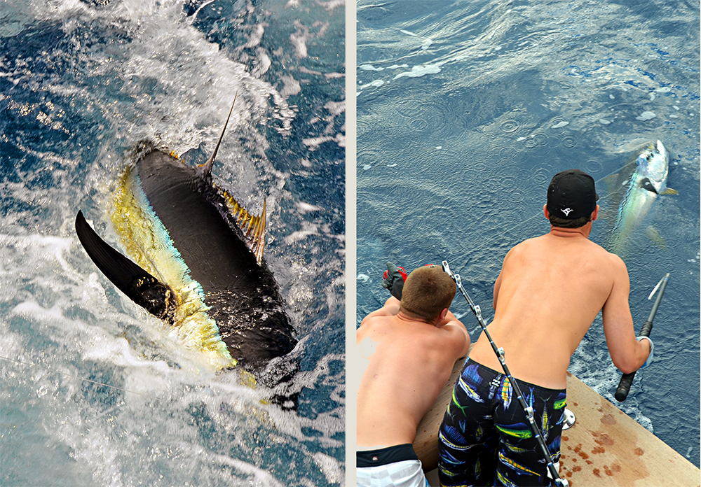 As we kept trolling north out of the canyon and on our way home, the center rigger went off again. I made sure we stayed tight on the fish from the tower and passed the rod down to Tommy and Seamus, who strapped into the harness and started recovering the 300 yards of lost line. Tommy leadered the fish when we saw color and he and Steve gaffed a 60-pound yellowfin — our last fish of the trip. Everyone agreed it was a great way to end our canyon run and we set a course for home.
