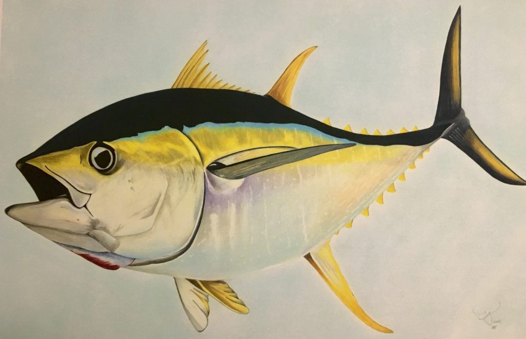 His body of work is a confluence of coastal subject matter that reflects his place, passions, and interests, so he enjoys immersing himself in the creative process because painting—like fishing—is a therapeutic exercise. “My job is very stressful. I come home and even though I’m exhausted, I can’t turn off my brain,” he said. “I’m the type of person who needs to be doing something, so rather than just flip on the TV, I’ll sit down and paint for an hour. It forces me to think about only what’s right in front of me, and I need that outlet in my line of work.” Weathered bobbers, bushels of blue crabs, fishermen, shark teeth, surfers, tunas, and seaside shops and restaurants … they’re all expressions of his personality and nautical lifestyle. “Everything I paint is a product of where I was raised and where I live.”