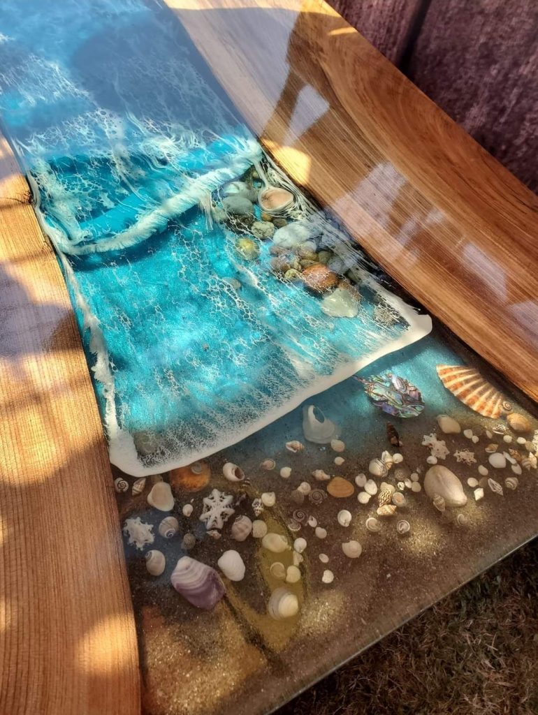 Hallinan’s “river tables” featured the path of a meandering riverbed, painted in turquoise, navy, and royal blues, beneath a shield of resin. His depiction of water using different shades of blue not only creates depth within each piece but also provides a unique contrast against the wood’s natural grain. The style was well-received, and eventually, he expanded his canvas to include cutting boards. “Before the ‘cutting board boom, ’” he chuckled, “I had seen a few people on Instagram mess around with paint and resin to create this look of a wave crashing on the beach. The wood base with ocean waves is inherently nautical, so I made a couple myself and kept practicing. It took me around six months to get my particular wave pattern to a place I was happy with.”