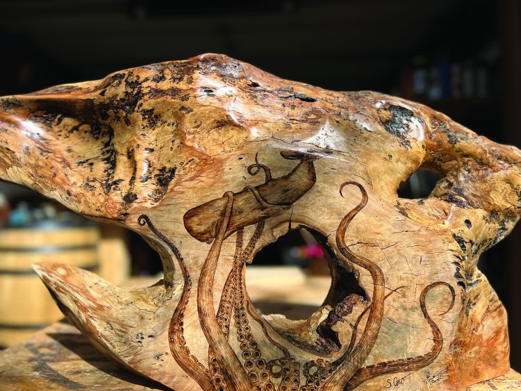 By word of mouth, demand for Cote’s pyrography pieces grew as he fulfilled requests for pet portraits, farm animals, landscapes, and life snapshots. His body of work drastically expanded when he experimented with nautical themes and marine life.