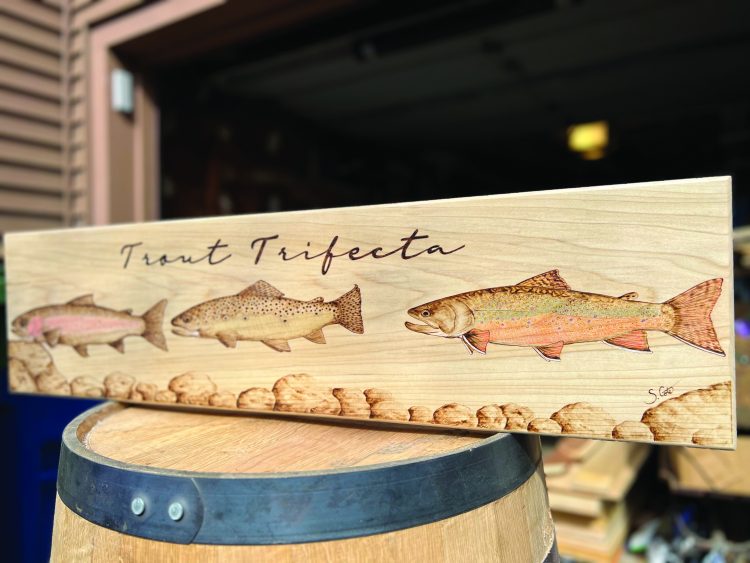Although he doesn’t consider himself a diehard fisherman, Cote enjoys creating nautical pyrography due to the acute attention to detail these pieces require. Like fishing, etching and burning markings into wood leaves little room for error; it is an immersive and focused process that requires patience and persistence to execute. A wood-burning pen allows Cote to attain a level of detail that even laser-engraved pyrography cannot achieve. It is because of the dynamic nature of fish—from their iridescent colors to the shape and size of each individual scale—that Cote finds closely detailing a striper’s stripes or a trout’s spots to be so rewarding.