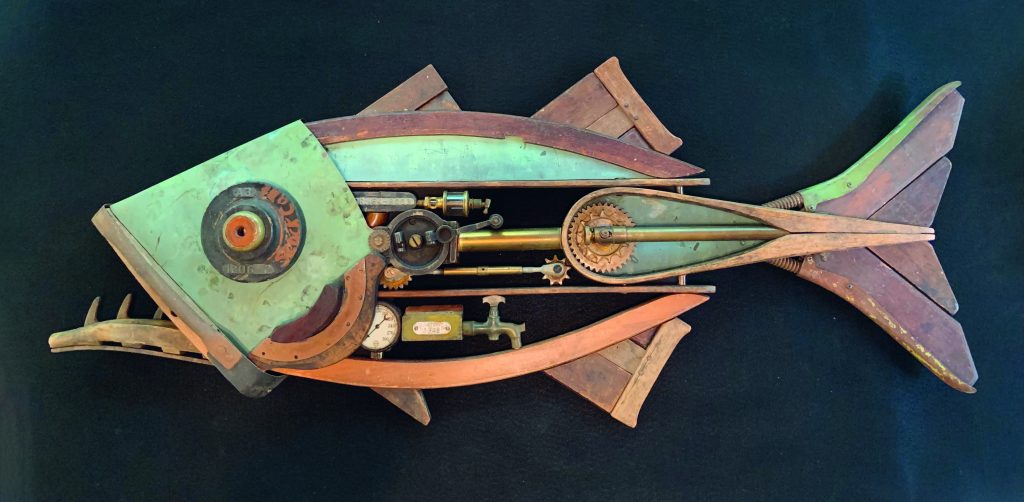 There is an undeniable quirkiness to Cromarty’s Found Object Fish Sculptures, and he has a good sense of humor about it. “If you’ve ever watched the show Hoarders on TV, those guys are amateurs. You should see my workspace,” chuckled Cromarty. He sells his art at shows such as the Mystic Outdoor Art Festival or at others located between Cape Cod and New Jersey, hunting for new materials all the while. And, despite his expansive basement workshop filling up with repurposed “trash”, a quick trip to the dump is all it takes to make space for building the next customer’s treasure.