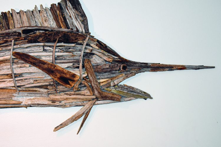 The driftwood Matthews collects is separated based on whether it will be part of the body, a fin, or an eye. “The eyes are hard,” he said. He prefers to leave the driftwood in its natural state, minimizing any alterations to fit it into the piece. However, some pieces speak to Matthews immediately, like a section of driftwood that looked like a marlin’s fin, so he built a marlin around it. He even sorts the pieces by shade, giving his creatures the countershading (dark backs, light bellies) common among marine life.