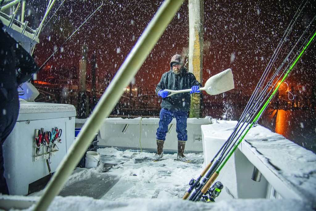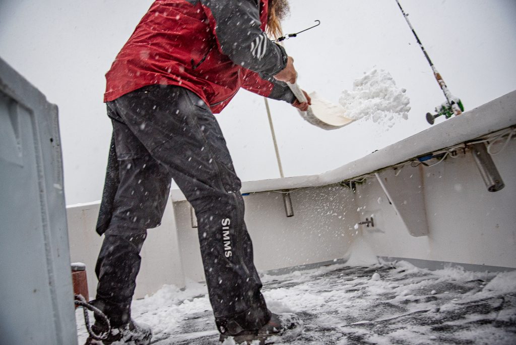 The deck of the Fishin’ Fever had to be shoveled periodically throughout the morning. Here, Rob Taylor clears the snow between drops.