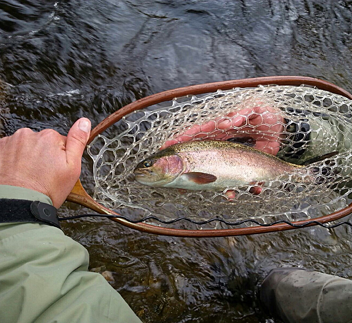 We traveled around the ‘fly-fishing-only’ areas using nymphs, streamers and bloodworms as the choice flies fishing the main rivers between First Connecticut Lake and Lake Francis to the south. Because I was working one of the cameras to film an episode of On The Water TV, it wasn’t until the afternoon of day three that I had my chance at catching my first river fish. I found an eddy behind a boulder and placed the bloodworm fly right where I knew there had to be fish. A fat rainbow trout proved me right, and then four more of his buddies did the same.