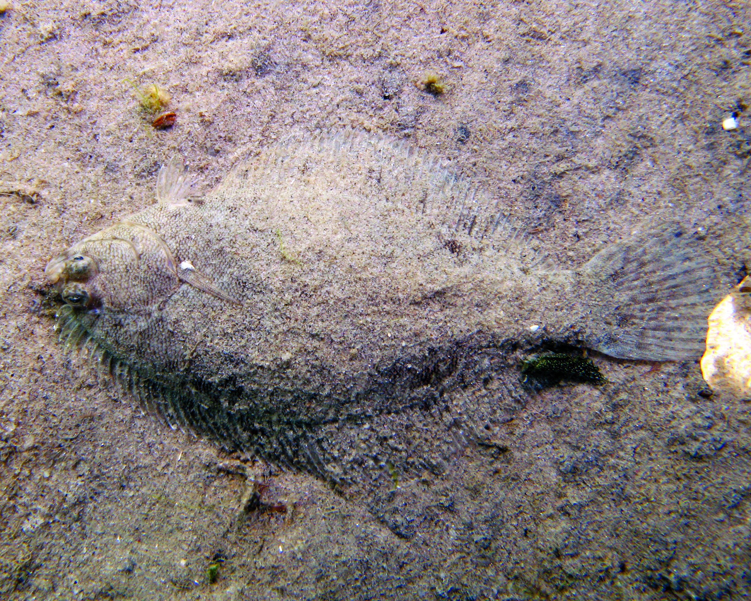 When it hatches, a larval flounder is like other fish – it has one eye on each side of its head and swims upright. As it develops, the larva goes through a transformation where one eye will migrate to the other side of the head, and the fish will begin to spend its time lying flat on the bottom.