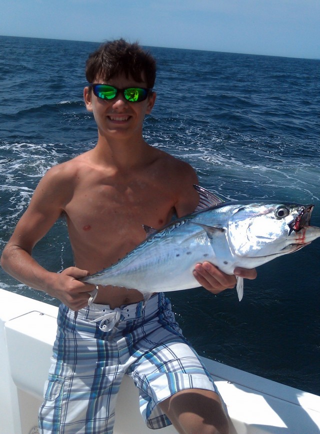 I’d heard reports of a few false albacore roaming around Martha’s Vineyard and Nantucket, but figured I was still a few weeks away from getting my first albie of the year when one of our light-tackle trolling outfits started dumping line on an early morning trip to the Hooter on Saturday. Chris Megan took the rod and watched helplessly as the spool got dangerously low. Fortunately, before it could take the last few wraps of line, the fish abruptly changed directions and headed for the boat. At this point, I’d made voiced with conviction that Chris was fast to a small bluefin tuna, not an uncommon occurrence for the Hooter. So imagine my surprise when an albie, easily in the teens, showed its colors next to the boat. Quickly after getting back on the troll, another albie hit, this one just as big. Over the next 20 minutes (most of that time spent subduing monster false albacore) we’d hook two more albies.