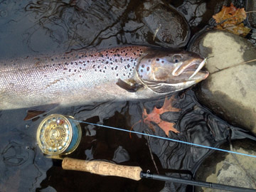 As in Rhode Island, the fading saltwater season has many anglers dusting off their freshwater gear or hitting deer stands. One sweetwater option that has become synonymous with late fall is broodstock Atlantic salmon. Over 1,000 salmon up to 15 pounds have been released in the Naugatuck and Shetucket River this year and no one has been able to keep any until this coming weekend (daily creel limit becomes one fish on Dec. 1). OTW contributor Chris Elser has been tapping into some 12-pounders on the lower Naugatuck River while swinging sparse flies less than two inches long that have white or chartreuse in them. He said these salmon are lazy compared to their wild brethren, so he concentrates on the deeper runs and tail-ends of pools. Chris noted that one similar instinct they do have to wild fish is that they like to take the fly right at the very end of the swing after following it for several yards! For more info on broodstock stocking and regulations, click here: http://www.ct.gov/dep/cwp/view.asp?A=4173&Q=511870.