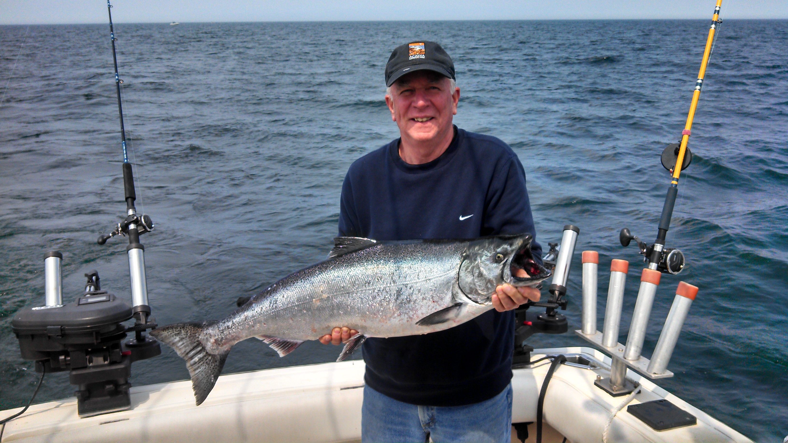 Later in the morning, you can head out to 100 to 150 feet of water. Fish 40 feet down for steelhead. The temperatures earlier this week were 50 degrees on the top and 44 degrees at the downrigger balls at 120 feet. Lakers are on the bottom in 110 to 150 and are hitting cowbells.