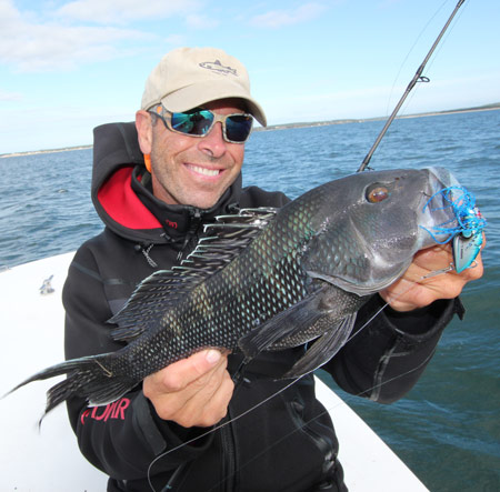 Meanwhile, you might say it’s a formal affair as rockpiles, reefs and wrecks just outside are filled with black sea bass and are starting to harbor blackfish. I recently had the pleasure of dueling with a black sea bass as well as an 8-pound class tautog on the same top/bottom rig. The bite is no deeper than 30 feet; what’s working for us is drifting over irregular bottom and I’m employing a blue Shimano Lucanus on the bottom and a 3-inch Gulp! Squid on the top hook. In my estimation, there is no better black sea bass offering than the Lucanus. And you don’t have to be fancy with it, just drop it to the bottom and quickly crank back up about 5 turns of the handle and then repeat the movement; the jig will do the rest. A conventional reel rules here. Remember that black sea bass has closed as of September 15.