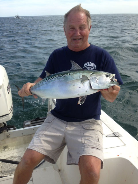 As we approached a mile offshore we saw birds, bait and fish boiling along a line parallel to shore about a mile long. Stayed in the melee until we exhausted our supply of hardware, picking up my first albie and countless bluefish on YoZuri shallow divers. Headed in with tired arms and busted equipment, but grins of appreciation.
