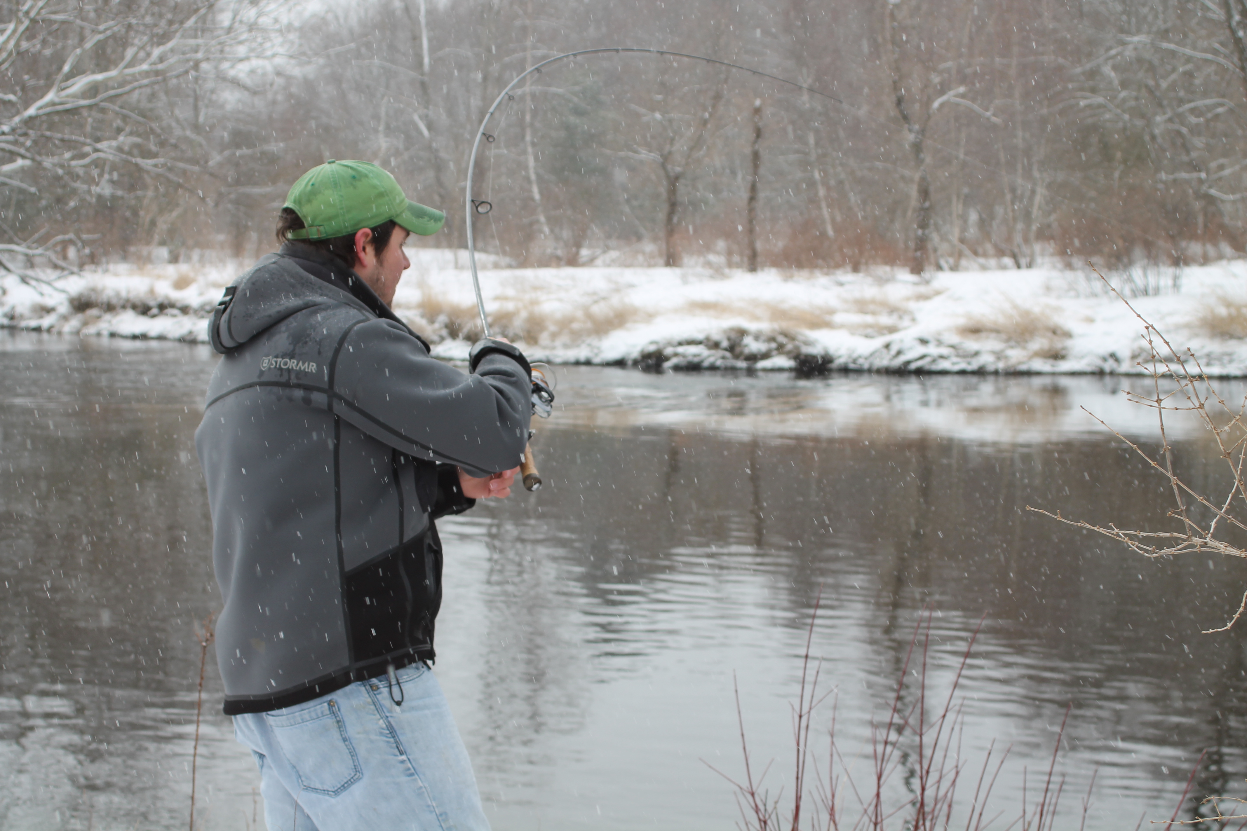 After lunchtime, the clouds parted and spring started to shine through. Hatching bugs replaced falling snowflakes and feeding carp kept us busy until it was time to leave.