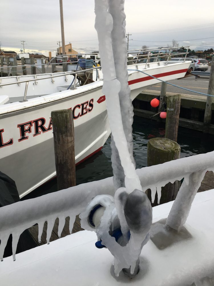 After a while I decided to stay hydrated and have a drink. Bad idea, it was frozen solid. To keep my lunch from freezing, it had to stay in a cooler in the cabin. After a couple of hours the bait froze, my gut rag froze, my handkerchief froze and fisherman’s fingers, toes, noses, ears faces, etc. began freezing. Slowly but surely guys started leaving the rail and staying in the cabin. When my fishing gear started freezing up I had to pull the line off the reel to get it going. Thank goodness I had on the proper waterproof gear, three layers of thermal clothing backup gloves and doubled up on my hand warmers. I could of used a fourth layer.