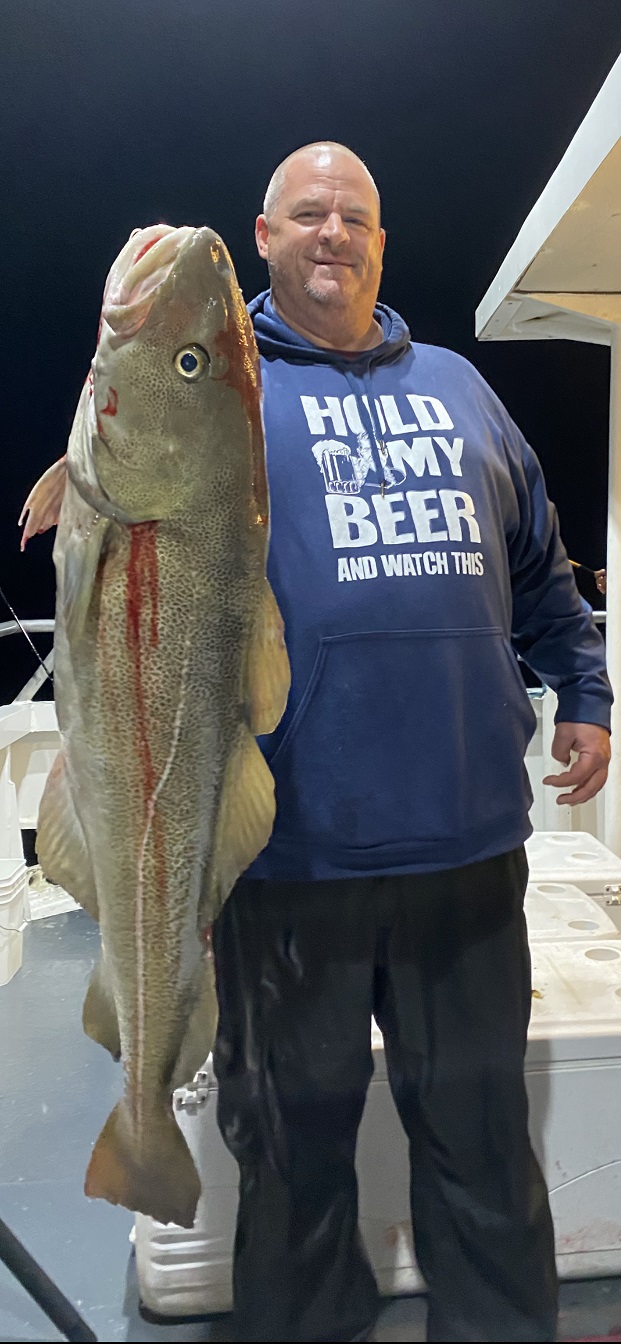 Michael Flynn fished aboard the Atlantic Pearl of the Captain Lou Fleet on Tuesday and boated a 35 pound cod on a Bay Park KO “killer cod rig.” The photo of him and his fish might be my favorite fishing picture I’ve seen this year.