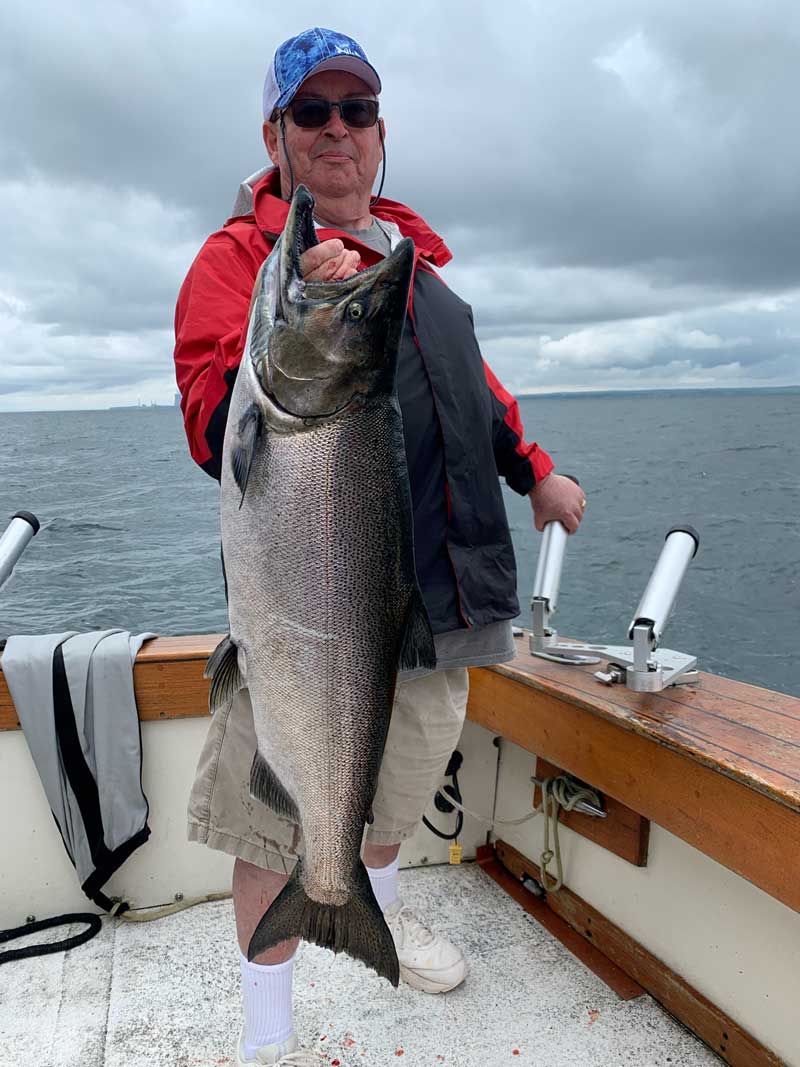 Fishing is scattered. A lot of big fish are being caught. Catches are 4-8 or 9 fish but not filling up the box. Some on meat, some on flies. We’re seeing fish that don’t want to bite (Steelhead). There’s a lot of run-off from the recent rain from the creeks with a lot of grass and weeds in the 150 range. There’s a lot of fish in there, but you’ll spend time cleaning your rigs, lines, divers and coppers. There’s fish at the 26-27 line, some mixed classes of salmon (big). Caught some at 300 and 200-220. No specific bait that’s working. Had a fish on meat, fly set ups, spoon bites (smaller fish). Temperature is good: 50-80 down on the riggers, divers out 180-200, 400 coppers.
