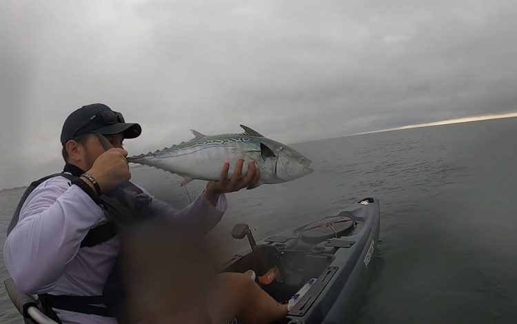 I can’t say with confidence that the mackerel were feeding deeper than the albies, because we saw them jumping occasionally. But, in my experience, Spanish mackerel tend to swim beneath schools to terrorize from below, slashing through unsuspecting pods of bait with acrobatic leaps. They go fully airborne, following an arch-like path in mid-air that makes them easily distinguishable from albies that roll, tumble and crash on the surface. I even managed to place an accurate cast into a frothing feed of albies, which rewarded me with my first of the year and my first-ever kayak albie.