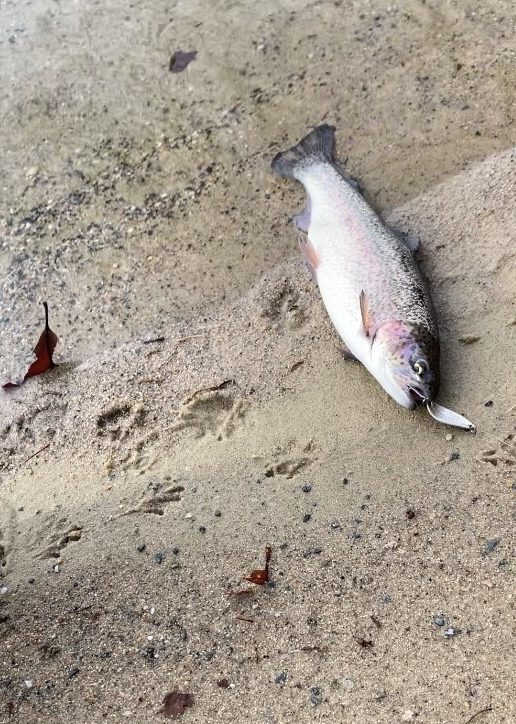 “I was out trout fishing and actually found this dead 21-inch smallmouth bass with a full catfish stuck in its mouth. The smallie had clearly been there for a couple while. A fly fisherman nearby came over to investigate, and after some struggling, pulled the catfish out of its mouth, and the catfish swam off like nothing even happened. When he pulled the fish out, it became apparent how badly the barbs of the catfish got stuck in this smallie; pretty good predation defense on their part.”