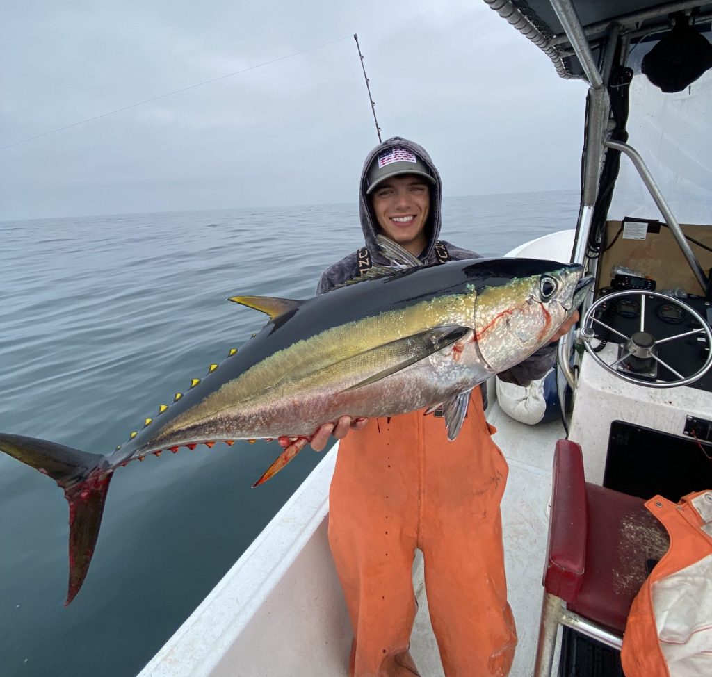 Captain Cam Faria of Cambo Charters said he made the run to the Canyons before the wind kicked up this weekend, which was his first time making the run in his own boat. He said he learned a lot of lessons that would make for a smoother trip next time around. Cam headed out at 11 p.m. on Sunday, arriving at the Canyons on Monday around 4 a.m. and said he immediately started trolling. Joined by Michael Xu and Cam’s friend Willy, the trio went 3 for 5 on yellowfin before the bite died off and Cam decided to head in early because the weather was kicking up. He did some striper fishing on Tuesday and Wednesday and did well in Cape Cod Bay. Give him a shout to book a charter!