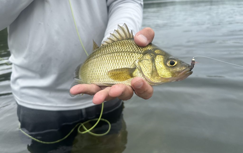When the weather went downhill and the wind kicked up, we decided to switch things up and do a little freshwater fishing. We headed to Mashpee-Wakeby Pond and ducked out of the wind a bit, so I brought out the 5wt fly rod and Sean got to casting around a small whopper plopper. We were into fish almost immediately, and even though we weren’t looking for big fish, there’s always the possibility a 3- or 4-pound largemouth or smallmouth will appear in shallow. Last year at this same spot, I watched a 3-pound smallie cruise up behind my black wooly bugger and slurp it right up, and as I stripped into the bite, the fish was already going airborne and shook free. As nice as a 3-pound bass would have been, we were prepared to catch mostly perch and sunfish, and we did just that. The fly worked best. We had white perch schooled up over grass taking crystal buggers and pheasant-tail nymphs, and eventually we tied on a small bumble-bee patterned popper, which a few big sunfish, small largemouth, and yellow perch took a liking to. It was a nice change of pace to wade in the sweet water with super light spinning and fly tackle. That kind of fishing is very calming, and I highly recommend giving it a try on the next day of foul fishing weather.