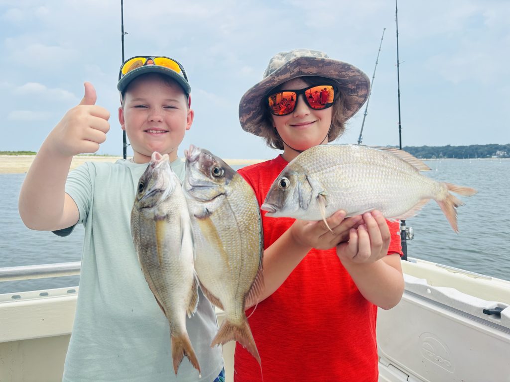 Captain Stu from Northport Charters reports: “Presently, we’re catching lots of fluke and porgies during our Kids Fishing Camp. We are mainly concentrating on bottom fishing now in the bays and LI Sound, and we are bending the rod and culling through lots of shorts to get to some larger fluke over the rail. So far this week, Dylan and Aiden have hooked some beautiful fluke in the 3- to 5-pound range. There are massive amounts of medium-sized bunker schools now in our bays and locally in the Sound. We’re also starting to see signs of snappers moving in—lots of bait! Plus, some croakers are coming up when we’re targeting porgies with clams.”