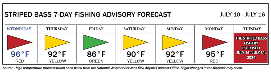As a reminder, all striped bass fishing in the Chesapeake Bay will be on hold from July 16-31 , in order to protect the fishery during what is statistically the hottest part of the year. But even when it is legal to catch one keeper-size striped bass per day, the Department of Natural Resources advises following our Striped Bass Forecast Advisory and avoiding catch-and-release fishing for striped bass on hot days.