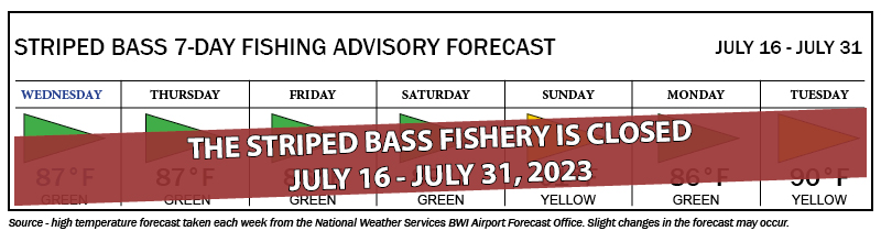 The striped bass season in Maryland waters of the Chesapeake Bay is now closed and will reopen August 1. The purpose of this annual summer closure is to reduce striped bass catch-and-release mortalities. Water temperatures in the Bay are generally running in the 86-degree range and are rising due to the continued heat. Striped bass suffer in these warm water conditions and the added stress of catch and release can be too much for them to recuperate.