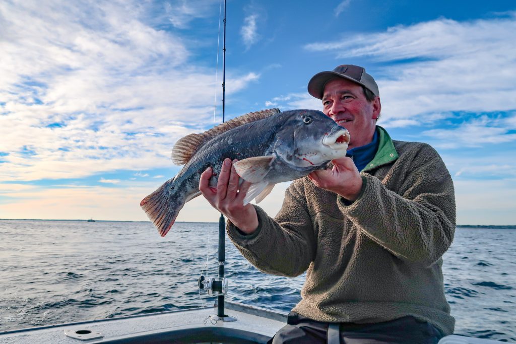 From Martha’s Vineyard, Captain Kurt Freund of Fishsticks Charters reports: “This Sunday saw a break in the wind and I took advantage of the opportunity to do some tautog fishing with my Fishsticks with Charter Sauce teammates, Hans and Jacob Riis. Jacob was home from college for the weekend and eager to spend some time on the water. It was a beautiful flat calm morning but the breeze did come up after noon. Still, a great November day on Vineyard Sound and Buzzards Bay. Fishing was good but not as good as last week. I am sure the fish are still around, but are probably moving to deeper water as temperatures drop. It’s likely that I just didn’t find the optimal depth. However, we did manage to land 4 keeper tog to 19 inches and a bunch more smaller tog and sea bass.”