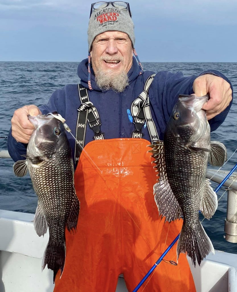 Sailing out of West Ocean City, Captain Monty Hawkins of Morning Star Fishing shared reports for both bluefin tuna and sea bass. On Friday the 27th, they cleared the inlet in slightly choppy conditions that diminished as the day progressed, which is always helpful when it comes to spotting tuna and bait on the surface. They headed north while most boats were south bound, but by 10:15 AM they doubled up on bluefin. The first knock down came on a diving plug, and about an hour later, they hooked another fish on the troll—the fish demonstrated a preference for plugs on this fine Friday in late December. After boxing that fish (the third of the day), tuna started blowing up on the surface all around the boat, but they didn’t receive another bite.