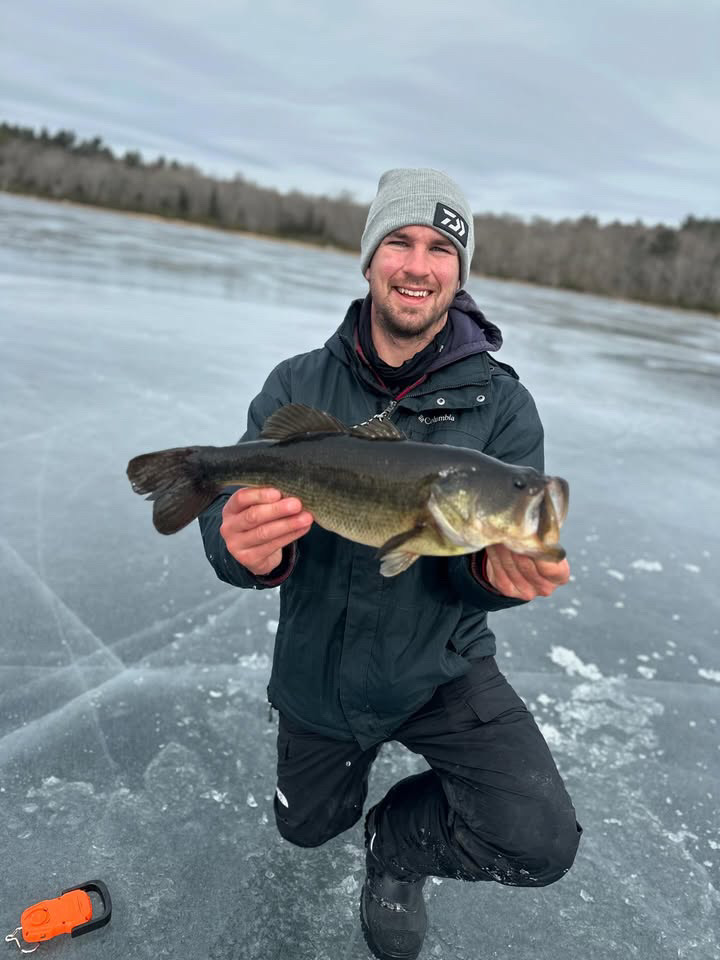 Declan O’Donnell at Breachway Bait and Tackle in Charlestown reported: “It’s been great to get some good ice this year. I’ve mainly been out targeting bass, but it’s been fun catching some panfish and pickerel as well. Unfortunately, this week we’re starting to see places become unsafe to fish through the ice. Fishing was really strong for a few weeks, as I usually find with RI ponds because they never get much attention this time of year. I got out last Sunday and we had good results including some quality largemouth bass.”