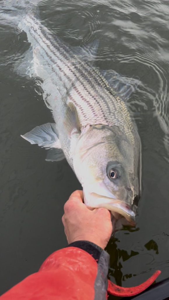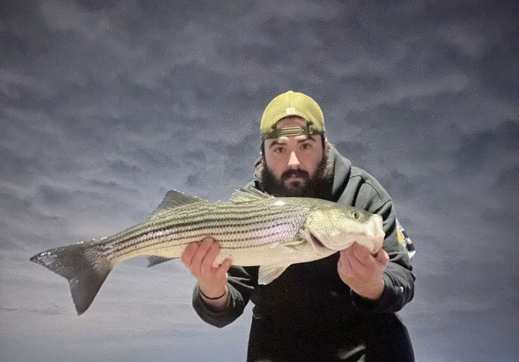 Andrew Bernat (@tactical_bassin26) in the Western Long Island Sound reports: “The bass are still on small bait—no pods of bunker in my area yet, but the average size of fish does seem to be around the slot. With water temperatures still in the mid 40s, an extra slow retrieve with an occasional pause has been the ticket to getting these cold, lazy fish to eat. Small X-Raps, SP minnow 13F, 3-inch Keitech Easy Shiners, and 20lb. fluoro leader are the keys to success!”