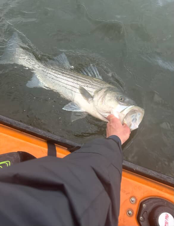 Karl Neumann (@kan313) in the NYC reports: “The fish have arrived near NYC and are chewing bunker and spearing. Usually we are throwing live bunker, but we were surprised to already see some topwater feeds! Aside from the bunker, the fish are readily hitting soft plastics. The bunker themselves are mixed sizes, from peanuts to jumbos. We are seeing mix sizes of bass too, with lots of slot-sized fish or just shy, with the occasional over slot. We haven’t really seen a push of those larger bass yet. I think after this new moon and warmer weather, we will have a solid push. Hopefully more bunker move in as well!”