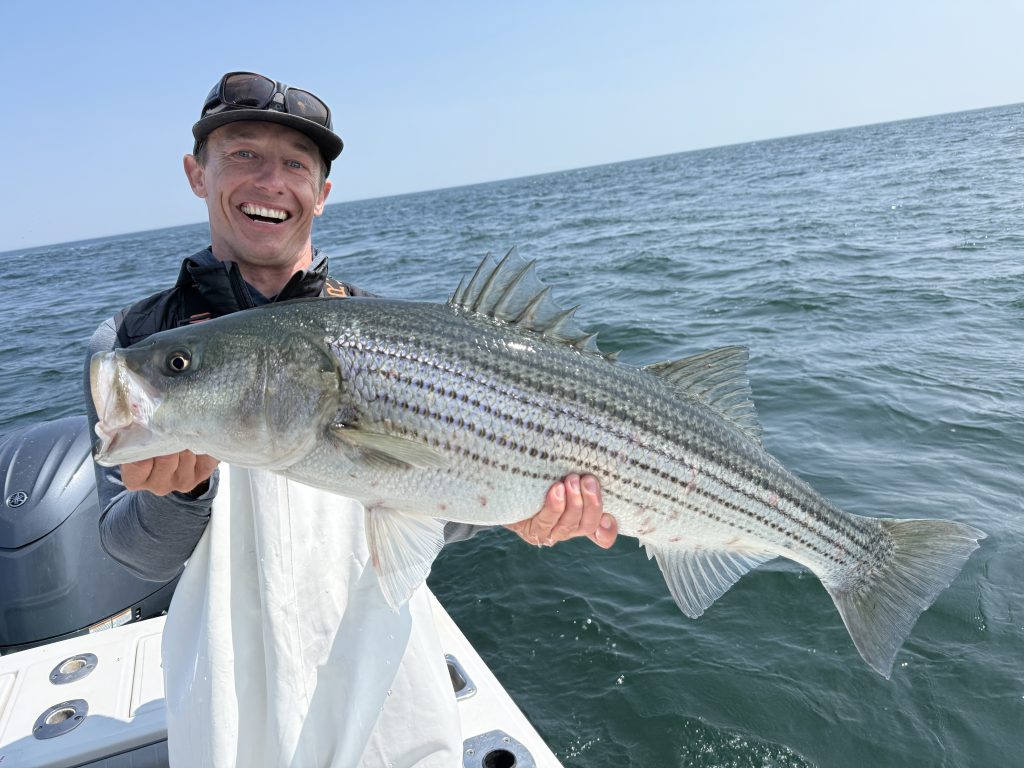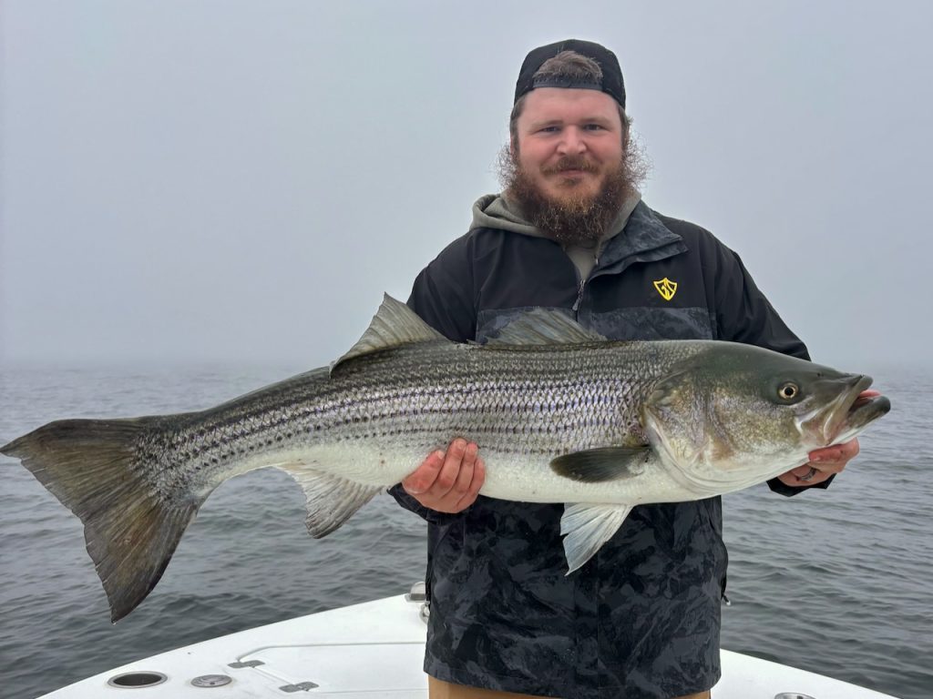 Captain Drew Downing of Down East Charters in Chatham reported: “We’re seeing bass of all sizes down here now. They’re really widespread though, and bait is ranging from tiny stuff under terns to bootstrap squid, butterfish, and the occasional pogie school. Fun fishing! No monster bass yet, but a whole lot of decent-sized fish in the area.”