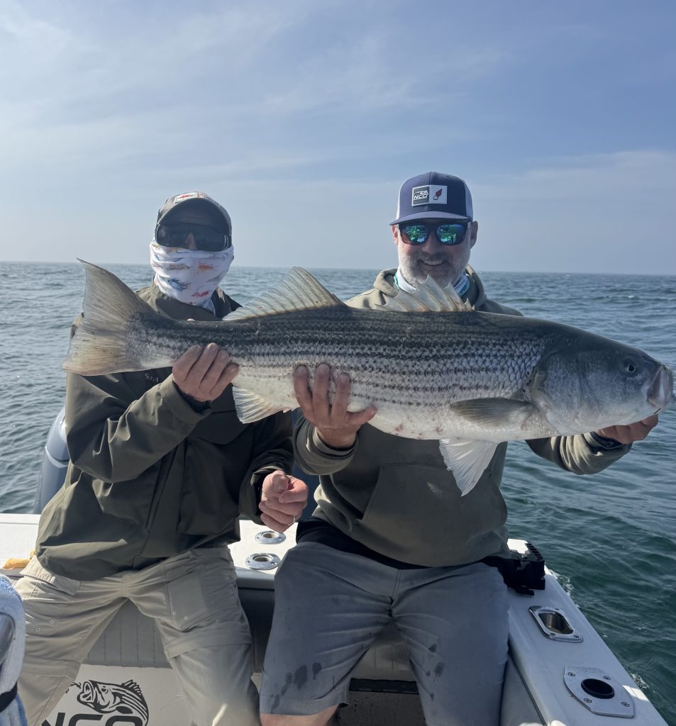 From Nantucket, Rick Ramos shared the following report: “From the Beach — Lately, the most consistent beach fishing has come when you’re casting into the wind—where choppy water pushes bait in close and brings the fish with it. That was exactly the case last weekend when strong southwest winds drove big bluefish onto the inside beaches of Great Point. Nantucket surf guide Tammy King landed a 36-inch blue in the heavy surf. She also reported that the early morning bonito bite at Great Point continues to be solid, and striped bass have been stacking along the outer shoreline, especially during moving tides. Reports of first-light bass action are heating up at Nobadeer and Fisherman’s Beach. Anglers willing to hike out to Smith’s Point have been rewarded—Greg Chotkowski landed a 39-inch bass on a 2.5-ounce bucktail. In the harbor near Polpis, both bass and blues are active, and bluefish are showing up around sunset at 40th Pole and Dionis. Hogy’s clear topwaters have been excellent for bass on bright days, particularly the smaller sizes. XL Albie Snax in white have also been outstanding for daytime bass, and IslandX Hellfire 180s—both the amber sinking and the white with blood-splatter pattern—have been top producers for both bass and blues.