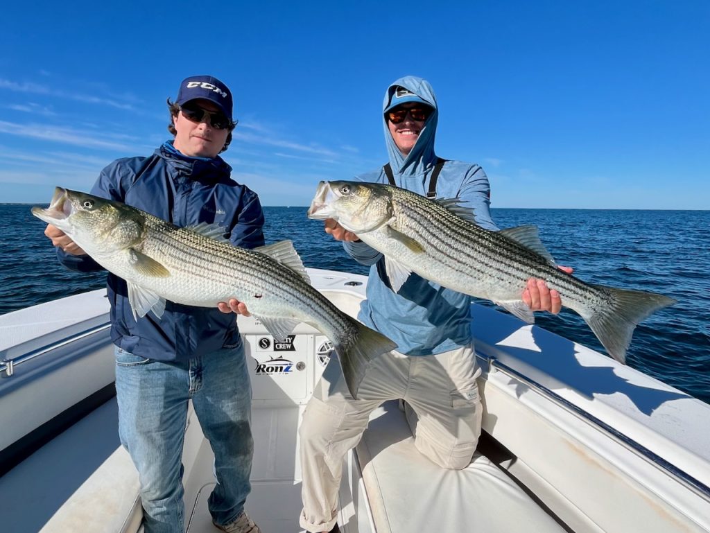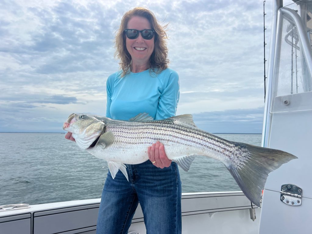 Captain Elena Rice of Reel Deal Fishing Charters in Truro reported: “This week if any was a true testament to the rule that success comes to those who adapt to change…and adapt quickly. While the week started with “easy” fishing close to shore on live bait and vertical jigs, the steep drop in water temperature disrupted this pattern and sent the Reel Deal fleet on some long hauls to keep our clients on the fish. As Captain Bobby says, he “ran the gauntlet” to find the fish and kept our boats busy with tight lines! Still some topwater activity to be had at sunrise and we look forward to seeing what these stronger SW winds will bring us for the upcoming weekend. Check out our availability here to catch your bucket list striped bass!”