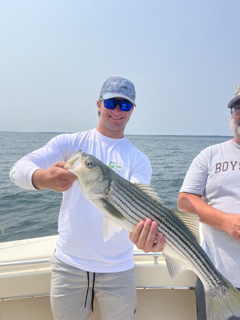 Captain Elena Rice of Reel Deal Fishing Charters in Truro reported: “What a week to be grateful for consecutive days of favorable marine conditions off outer Cape Cod and the continued presence of striped bass surface shows! We’re trying not to get spoiled, but the acres of topwater splashing stripers has sure been nice to see most every day. Lighter-colored slim-profile lures reeled with a slow twitch are generating multiple bent rods while our tube-tailed diamond jigs wait their turn for the later afternoon hours. Awesome to have such a great striper bite still going strong into August. We have one opening left for the upcoming weekend—check it out here!”