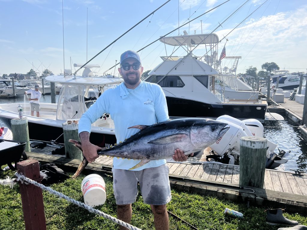 From the tuna grounds, Anthony Ferrandino of Go Deep MTK (@godeepmtk) reports: “Coming out of the new moon, a big push of white bait moved inshore. Walking out deep on the tides and putting in hours overnight, we picked a few striped bass under 25 inches off the sandbar, with some bigger 30 to 35-pound fish showing at sunrise. I’ve also heard whispers of even larger ones. Most were taken on small lures—the 40g Slob Slammer hybrid epoxy jigs bounced slowly, and a few on ½- to ¾-ounce bucktails with pork rinds in the white water. Before the hurricane winds kicked in, gator blues up to 20 lbs were smashing bait against the rocks, making for nonstop daytime action. The hubcap porgies have also moved in heavy—great fun on 60- to 80-gram jigs and light gear, but watch out for threshers; they’ve been taking plenty of hooked fish. After the hurricane, I’m expecting hungry fish and strong action. As the water cools, the fluke should push off the shoals, and the long-term forecast looks promising for a productive fall run—if we can avoid a direct hurricane hit.”