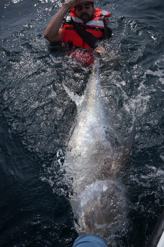 Then, with 20 minutes left in the day, Captain Carter made a blind cast with a Skipper that was immediately crushed by a monster tuna. The first run peeled 100 yards. Carter fought it for 45 minutes before tiring, so I took over for another 45. Then Matt stepped in, and we rotated for 3.5 hours until finally bringing the giant boatside. The yellow-and-white Skipper hung from its jaw—it had to be over 70 inches. After the hook was removed, Matt jumped in for a hero shot before the release.