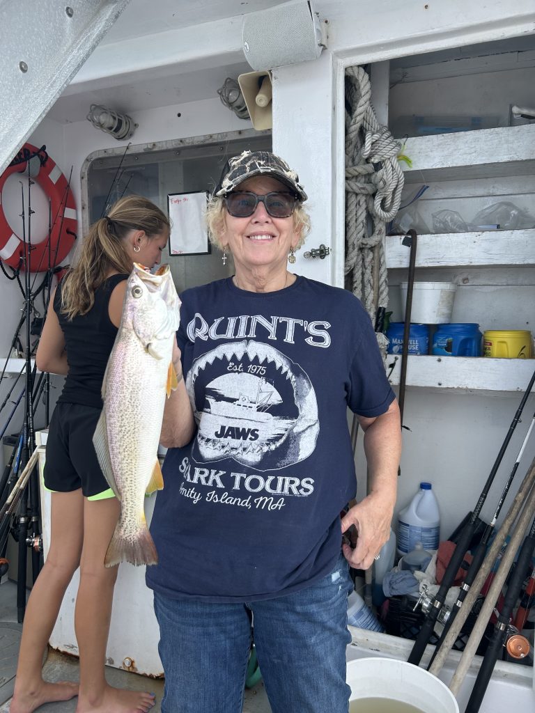 Capt. Skippy in Mount Sinai Harbor reports: “We saw some solid fishing after the winds from Hurricane Erin died down. On the plus side, the storm blew in some weakfish, which have been mixing in with the sea bass and porgies on rock piles and wrecks making for some awesome mixed-bag fishing! Striped bass fishing continues to be going strong with some bluefish mixing in. This week we landed bass to 44 inches and bluefish to 12 pounds trolling, jigging, and casting topwater. We have been working with GrayFish Tag, tagging over-slot striped bass for their research, giving customers the unique opportunity to catch, tag, name, and release large striped bass all in the name of science. Shout out to Sean and his crew, who landed a big bass on light tackle which we tagged, released, and named Nemo. Some large gray seals have taken up residency at the local bassing grounds, so reel in your fish quickly to avoid getting taxed! Fluke fishing has died off on the shoals and your best shot at a keeper is by targeting deeper water on drop-offs and around structure with large baits.”