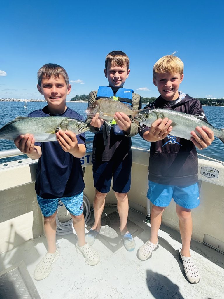 Captain Stu Paterson of Northport Charters reported: “This week we are wrapping up kids’ fishing camp and running regular charters, catching bigger cocktail blues, porgies up to 2 1⁄2 lbs, the occasional weakfish, sea bass, and some fluke! Last Friday at camp, Claire landed a 25-pound bullnose ray—an awesome fight. She got it over the rail, and we released it safely to live another day. A week ago, coming into Huntington Bay from the Sound, we had about 50 dolphins follow us in, riding our wake and leaping behind the boat. It was an incredible sight and a great reminder of the life in our amazing marine ecosystem. The kids were ecstatic! Call or text 631-707-3266 or visit northportcharters.com for info and availability.”