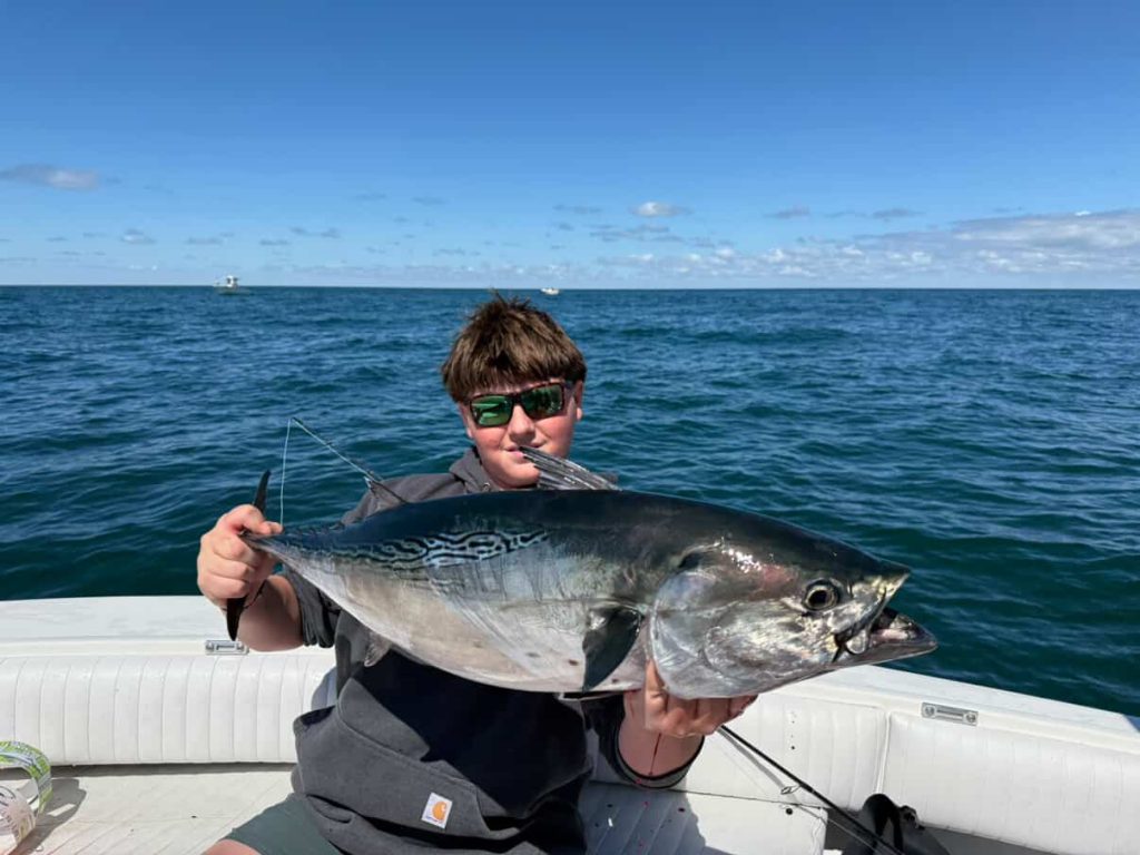 The biggest albies, it seems, have been stationed off Nantucket where OTW’s Jack Larizadeh and Johnny McIntyre got into them good on Monday. Even out there though, the albies were very quick up and down, which Johnny and Jack attributed to their diet of tiny squid. According to Johnny, finding birds, whether diving on bait, hovering, or sitting, was the key to their success. Blind casting around the birds was a productive approach when the fish weren’t showing on the surface. They wound up hooking a total of 6 and landing 4. Later on, they spent some time vertical jigging bonito, which are all over Nantucket Harbor—no secret there. If you found bonito, Johnny said, they’d hit anything you put in front of them. Must be nice!