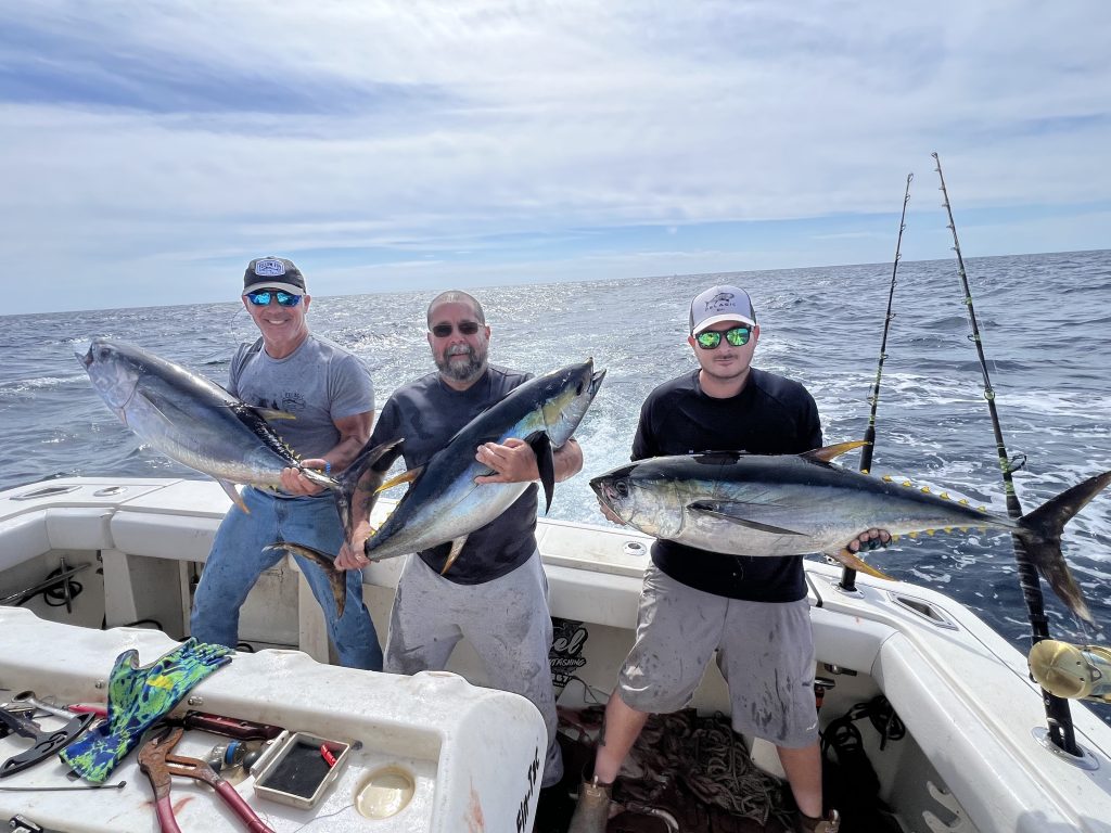 Captain Chris of Keepin’ It Reel Sportfishing out of New London told me that for the last several weeks, he has been fishing and following the water that has been with that big eddy out east of Veatch Canyon. It’s finally pushing west, with the backside around Atlantis. They found more bait and fish hanging on the cold side of the break. They picked up a couple yellowfin as soon as they set in on the bank, then started marking some bigeyes down deep while working the wall of the canyon and cashed in on the overnight bite as the sun started to set. Immediately, they had yellows in the slick up high and feeding. It was another bail job until the wind picked up. They then went on the move to find some swordfish and went 0/1. Come morning, they started to look for bigeyes on the troll and managed to raise the right one, which acted erratic until they got it near the boat due to a massive tiger shark looking for a meal, and unfortunately, wound up breaking it off. Overall, the fishing was incredible and they took home another limit of yellowfin up to 75 pounds and a longfin (albacore) after going 0/1 on swords 0/3 on bigeyes.