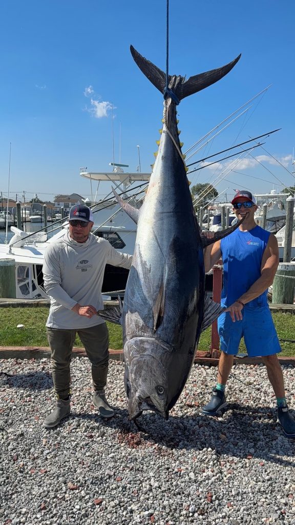 Captain Adam Ross of Tuna Cartel (@tunacartelofficial) reports: “With the commercial bluefin tuna season coming to a close, we decided to look for one last giant… to say the least, that’s what we found. Not only did we land a giant but we landed a personal-best tuna on my boat. These giants require top-notch gear. Our preferred setup is a Joey’s Custom 130 rod, 130 Alutecnos Gorilla reel, 150-pound Blue Action fluoro, and a 9/0 Owner Mutu hook. As for bait, large, live bluefish is the move! While this fish was massive, we had it tied off to the cleat in 30 minutes. It actually took longer to try and get the fish in the boat than it did to battle it. All said and done, this beast went 105” and 556 pounds dressed.”