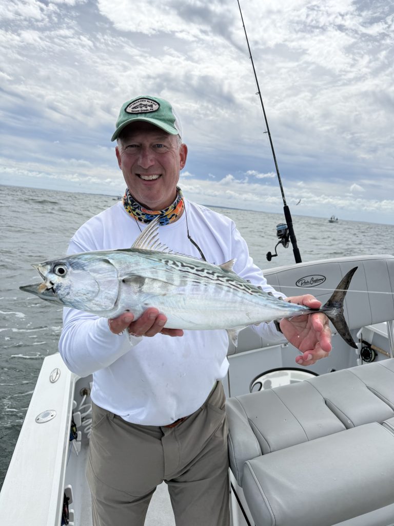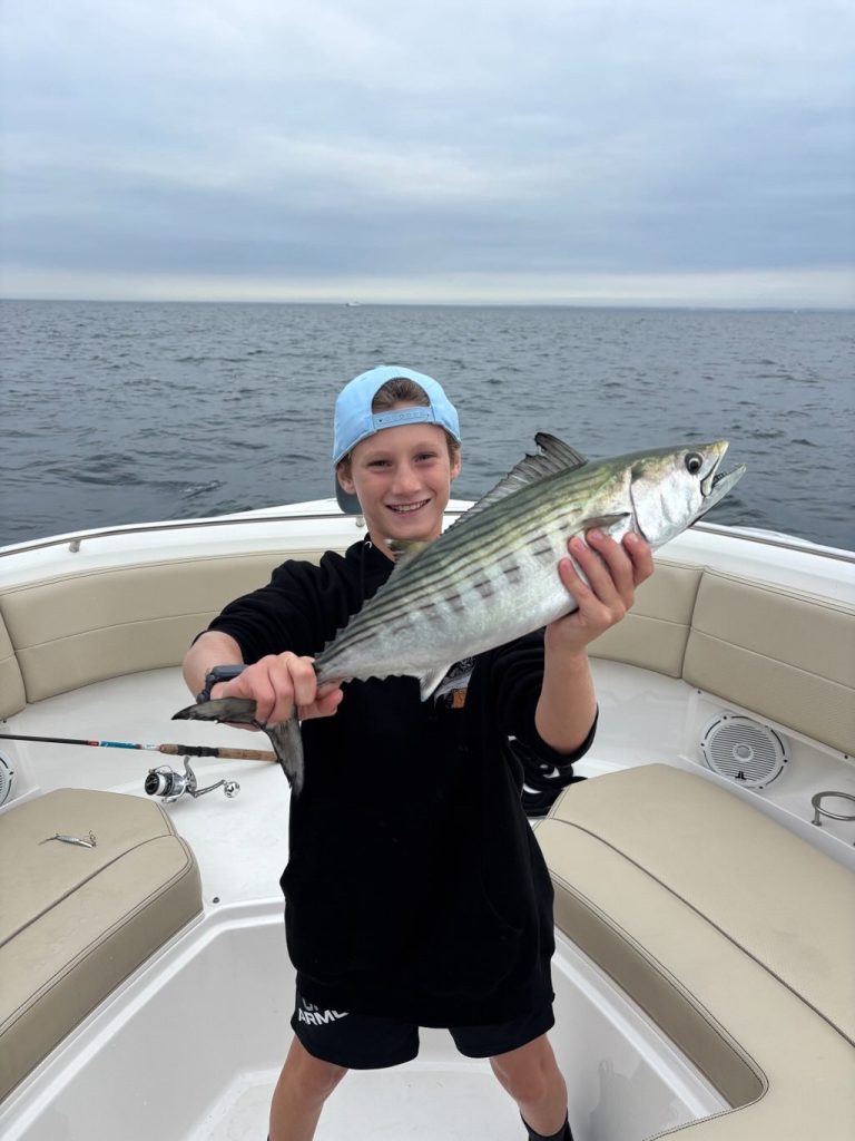 Luke Fritz (@fritzluc) and his son Jake went out with Captain Bobby Tambascio (@tambasss) of TamBASS Charters and reported: “Tuesday morning we hit the North Shore and conditions were perfect… overcast skies, with some light wind to start. The bonito loved the weather. However, once the wind picked up, it became harder to find the bones on the surface. Overall, we had a steady 45 mins of good, consistent feeding action. The telltale signs of fish were birds flying low to the surface, and as soon as they started dive-bombing, bonito erupted on the surface. The fish seemed to be moving up and down super fast. A 3/4-ounce jig (in silver, blue, or pink) with medium/fast retrieve got the job done. Both Jake and I crushed fish!”