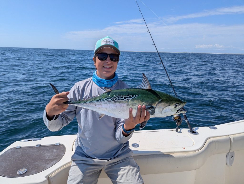Captain Drew Downing of Down East Charters in Chatham reported: “This past week has been a similar hunt for consistent fishing around Monomoy and Chatham. Bait has been so widespread on the east side that you literally have to jump around until you finally find fish underneath the birds. When you do, the action has been great. However, those patterns have been tough to establish day in and day out. Albies have been very spotty, decent numbers of bones even in those mid 50s surface temps, and again—scattered bass and blues.”