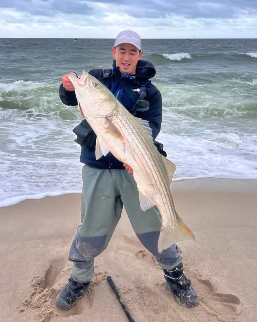 Gary Huang (@gh_fishing26) on the South Shore reports: “On the morning right before the nor’easter, I headed out before dawn in search of a big bass. I started the day bucktailing on the beginning of the incoming and didn’t get a single hit for hours. As the sun rose and the tide picked up, I made my way down the beach and towards my car, almost ready to call it quits. I decided to tie on an A27 green tube diamond jig as a last ditch effort. On my third cast beyond the building whitecaps, my rod doubled over and the drag started screaming. It didn’t feel as chaotic as a blue, as deadweight as a dogfish or big skate, and certainly not like any other bass I fought before. The fish constantly changed directions, bringing me up and down the beach. With its violent but controlled head shakes, I knew I probably had a trophy striper on my line. When I finally had it close to shore, I made sure that every time a big wave hit, I reeled in all the slack quickly. Finally, I had it on the sand and couldn’t believe my eyes. With my rod, I estimated the fish at around 45 inches — by far my new PB. I revived it and released it after a few pictures, along with my car keys that fell in the water and washed away amid the mayhem. The ocean gives and takes, and it was a tradeoff I’d take all over again!”