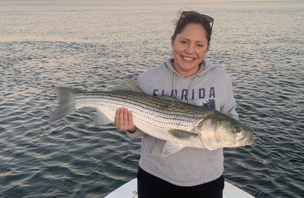 From the Central Sound, Sean Conway (@long_island_fishing_guy) reported: “Bass are picky recently and not many around off the beach. In the back bays there’s small bait and shrimp that bass seem to be keyed in on. Under dock lights, there are schools of peanuts, bay anchovies, and spearing with bass ranging from 15 to 31 inches crashing on them.”