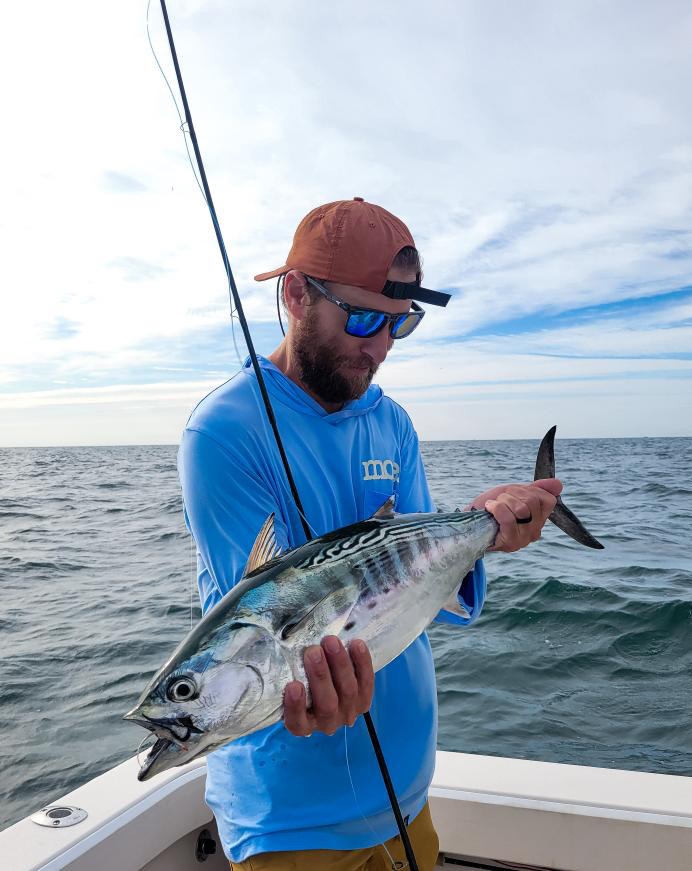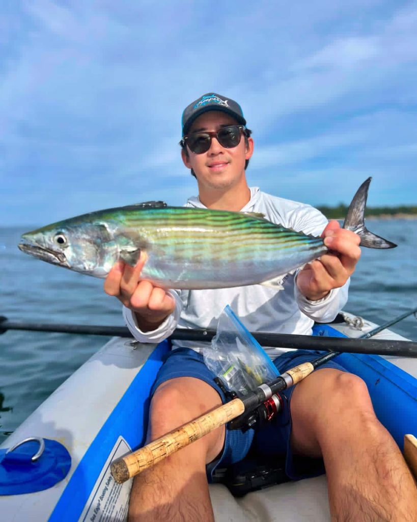 Gary Huang (@gh_fishing26) reports: “I started the day at sunrise looking for birds. The beach was dead for hours, but once the tide started going out in the afternoon, my friend and I finally saw the first signs of life. We scrambled to get the kayak in the water and paddled out to the birds. On the second blitz we chased, I hooked into a fish that initially didn’t seem quite as strong as last week’s albies. I thought it was a blue, but as it got closer to the boat, it started making some aggressive runs straight down. It bent my rod tip into the water over and over, screaming drag and all. Once I finally saw some color, I realized it was a bonito! We tail grabbed it and continued chasing the blitzes, which were smaller and less frequent compared to last week. We only got blues after that, so I consider myself very lucky to have gotten on board with my first bonito of the year. Shoutout to Game On Lures; their 3/4-ounce gold Exo Jig was the perfect imitation for the spearing these fish were gorging on.”